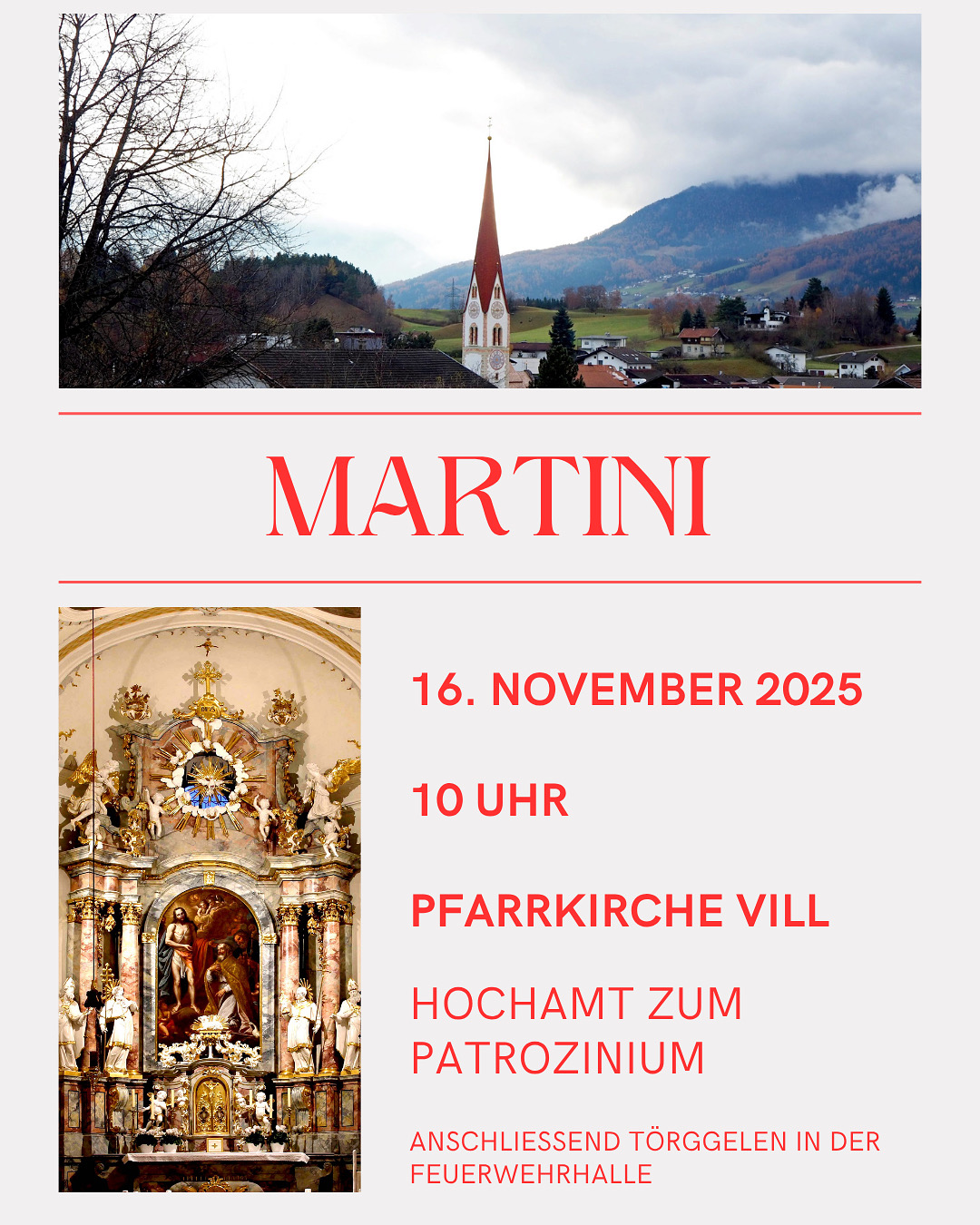 November 7, 2025 In News Martini Herzliche Einladung zur Feier unseres Kirchenpatrons in Vill! ShareFacebook